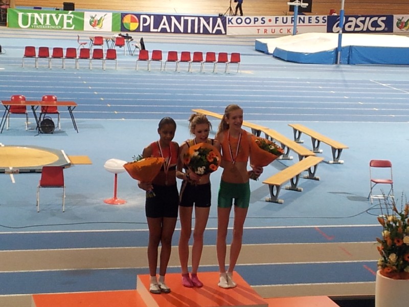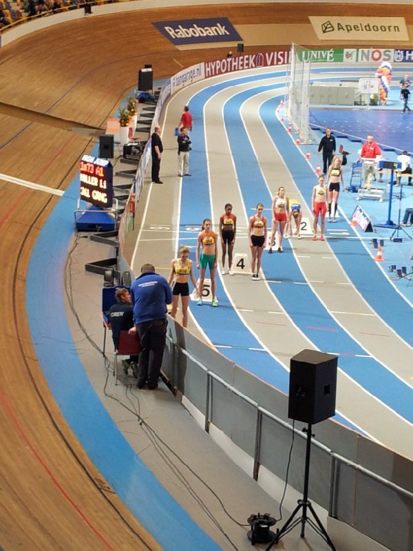 En toen was daar die finaledag! Nog een keer een rit naar Neerlands enige, maar mooiste indoorbaan Omnisport in Apeldoorn. Om 14.45 uur vertrok Elke samen met Ruud naar de beneden om zich los te werken, warm te lopen en de laatste puntjes op de i te zetten. Ouders en supporters boven in de hal hadden ook enige kriebels in hun maagstreek, maar nadat om 15.50 uur het startschot klonk, werd al die spanning omgezet in luidkeelse aanmoedigingen. De eerste 450 meter bleef de groep nog aardig bij elkaar, maar daarna werd het tempo door de latere winnares Danaïd Prinsen van Aquilo (1e in 2.11.53) opgevoerd en konden Ashley Melcherts van CAV Energie (2e in 2.13.76) en Elke mee ‘ontsnappen’. Even leek Elke een gat te moeten laten vallen, maar richting finish wist ze nog eenmaal aan te zetten en stond de klok voor haar stil op 2.14.50, een fraai PR en een bronzen NK plak.