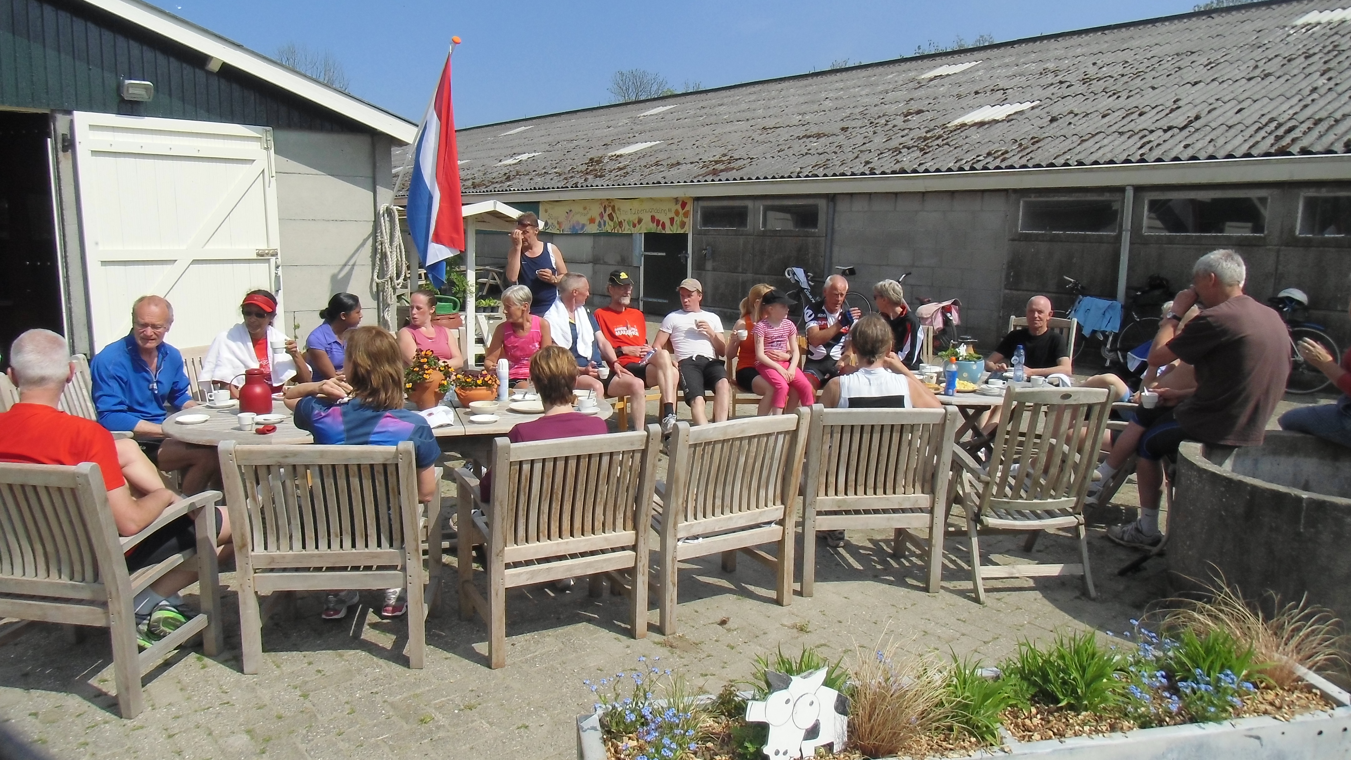 Eline Maat (dochter van Myriam, 9 jaar jong) toonde zich bijzonder bedreven in het begeleiden van de groep op haar fiets. Teruggekomen bij de uitvalsbasis aan de Visvijverweg kon de groep zich laven aan koffie en thee die klaarstond dankzij Anneke Schoone. Enige groepsleden hadden zich de dag ervoor in de keuken drukgemaakt, waardoor men zich ook tegoed kon doen aan appel(kruimel)taart.