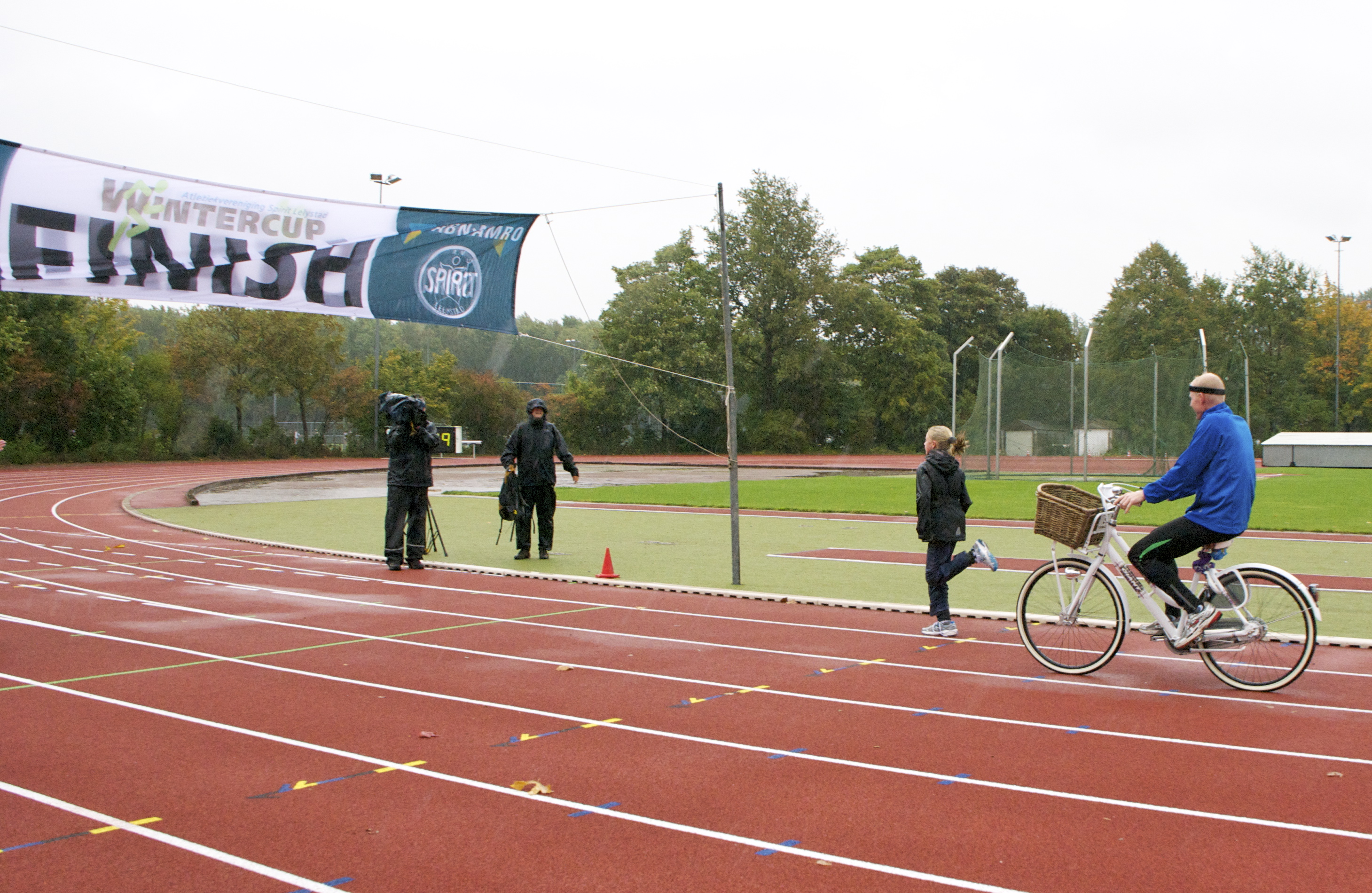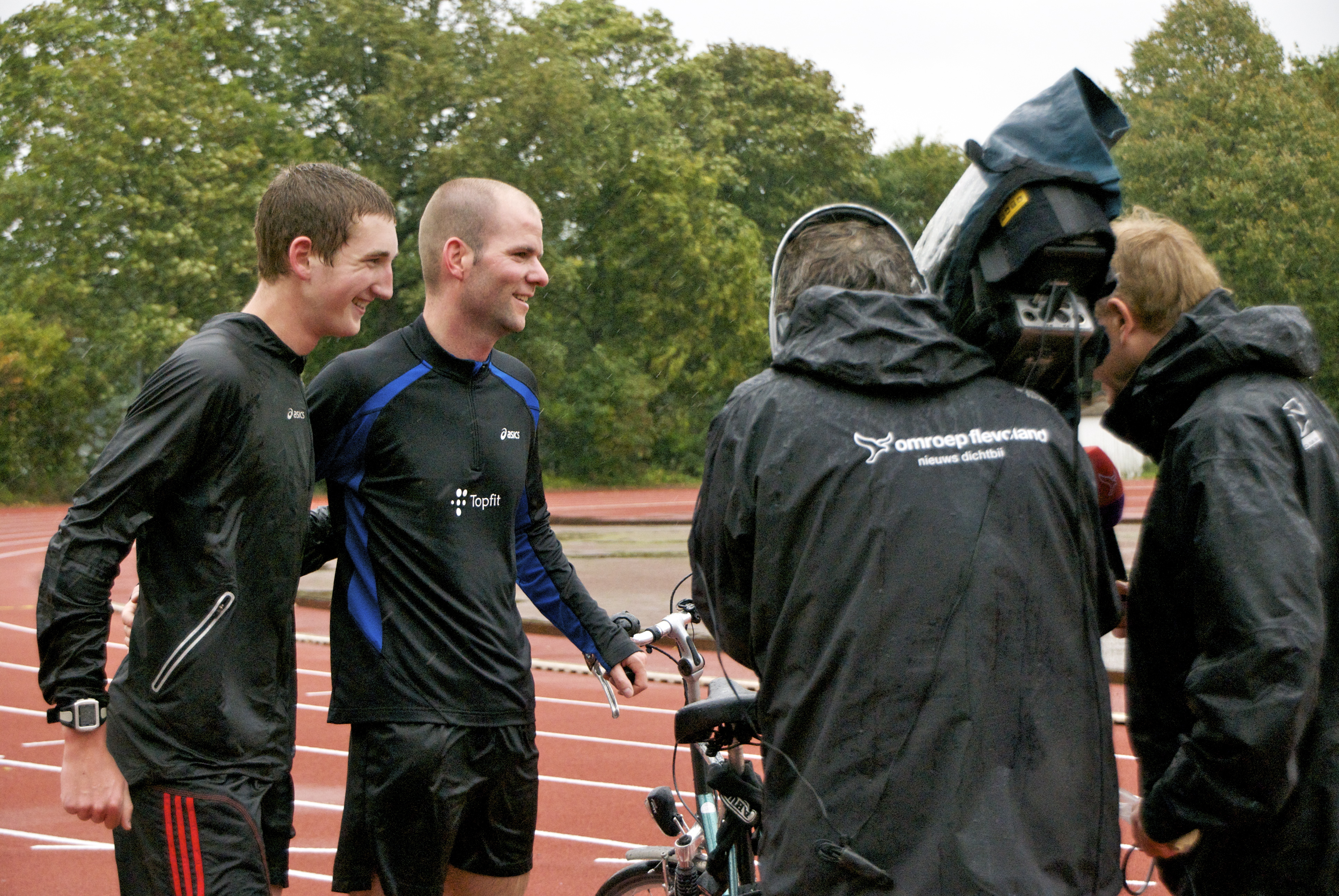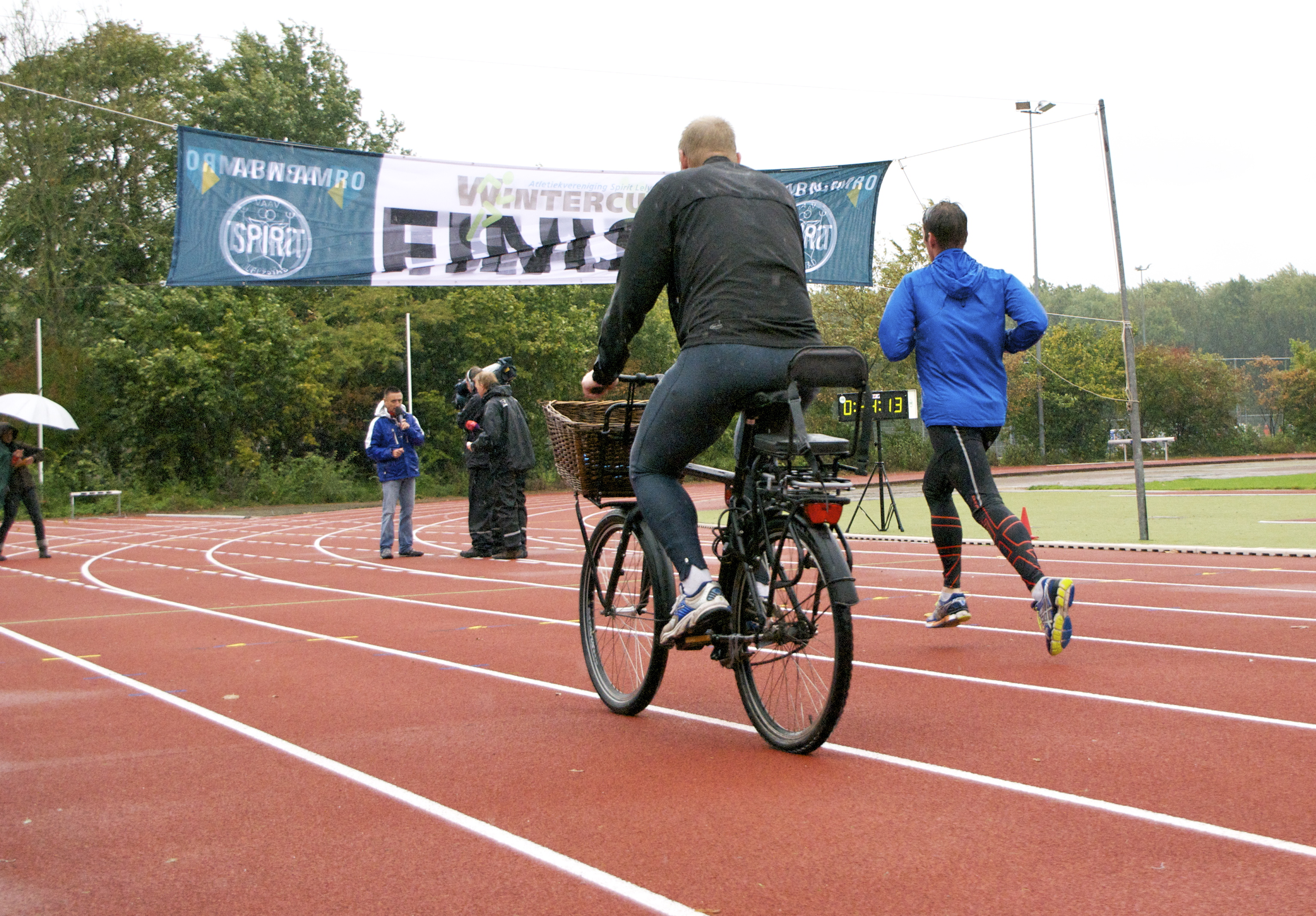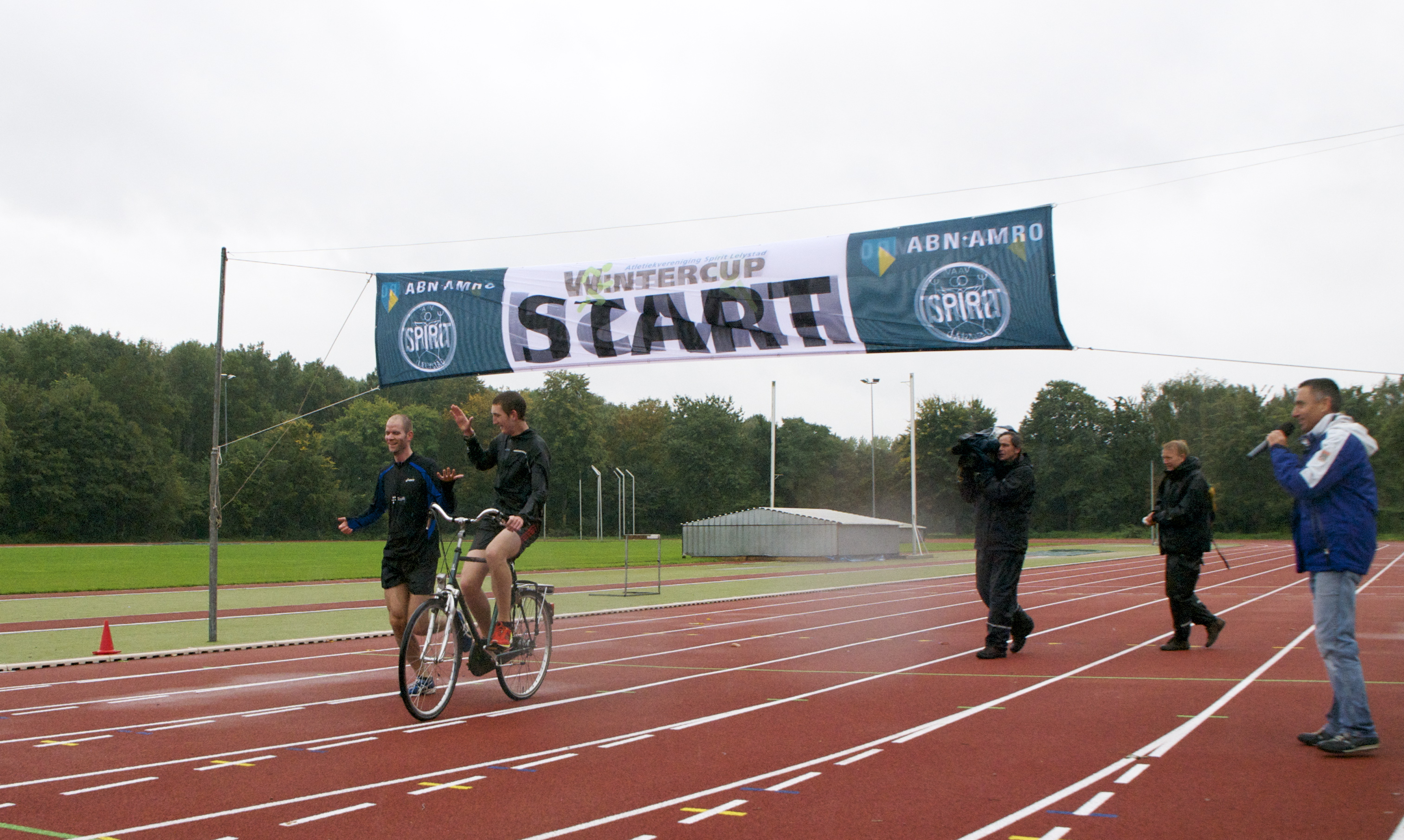Ondanks de waarschuwing van het KNMI voor “extreem weer” begonnen er zondagmorgen toch elf koppels aan de cycle-run van onze vereniging. Terwijl wind en regen de wachtende atleten teisterden, maakte Flevoland Sport nog snel een paar opnamen voor de start. De cycle-run is het enige sportevenement van Spirit waarbij de atleten zowel dienen te lopen als fietsen.