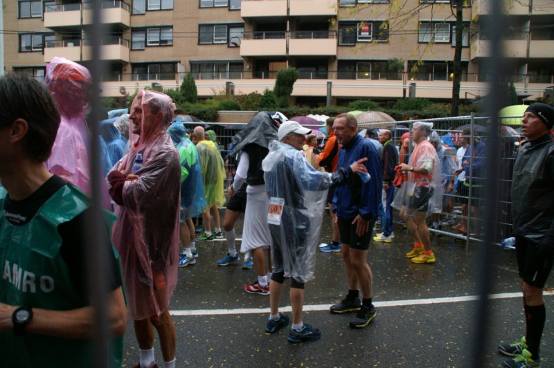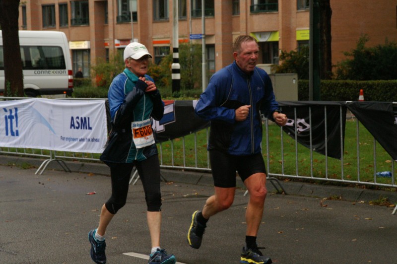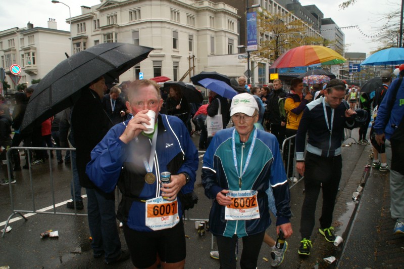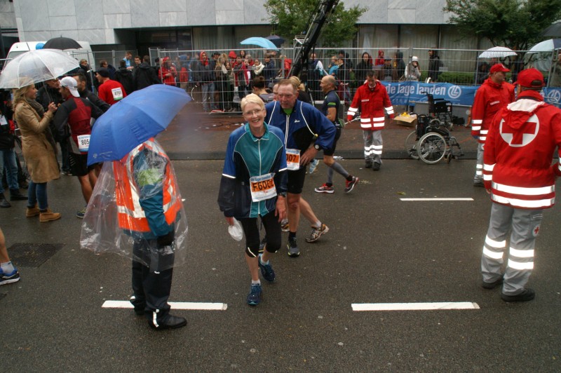 Ria streed haar eigen strijd bij de NK in de categorie V60. Voor de V65 waren te weinig inschrijvingen. Met Dolf als haas gingen ze om 10.00 uur van start in weersomstandigheden die je niet wilt hebben als je een marathon loopt. Trouwens, ook niet als je geen marathon loopt. Na de start trok de schrijver dezes zich dan ook snel terug in de warmte van de camper. Na 2 uur kon ik me er toe brengen om bij het 22 km punt een kletsnatte Ria en Dolf te zien passeren, wonderwel op schema. Ik spoedde mij weer naar de kachel.