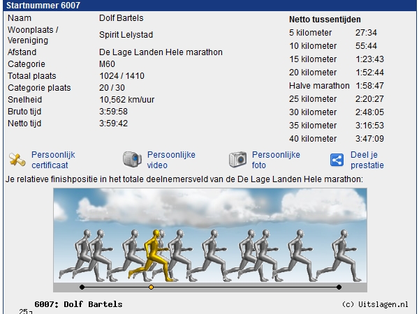Dolf, die zijn taak als haas voortreffelijk heeft gedaan, finishte in een tijd van 3.59.58 (netto 3.59.42). Rekenen kan Dolf wel.