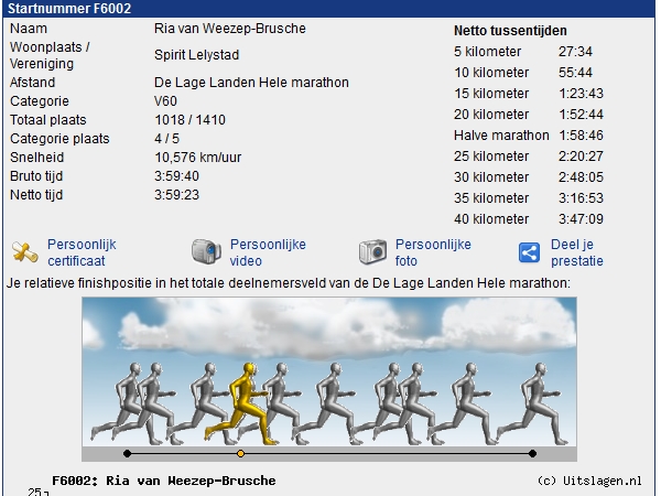 Bij de finish werd het spannend. Zou het Ria lukken, ondanks de zware omstandigheden, een podiumplaats te halen of misschien zelfs een verbetering van het Nationaal Record bij de V65? Ze moest dan binnen de 3.58.16 finishen. De finishklok tikte onverbiddelijk door. Mijn blikken gingen van de klok naar de weg. Nog steeds geen Ria. De tijd verstreek en een record zat er niet meer in. De 2e dame V60 passeerde de eindstreep, ze kon misschien nog 3e worden. Dan plan B, finishen binnen de 4 uur. De klok ging naar 3.58, 3.59. Nu werd het echt spannend. 3.59.30. Ook dat leek niet meer haalbaar. Of toch wel? Want daar kwam Ria aan, een paar verkleumde handen gingen omhoog en ze kwam binnen in een bruto tijd van 3.59.40 (netto 3.59.23). De speaker kondigde Ria aan als 3e in de categorie V60 bij de NK.