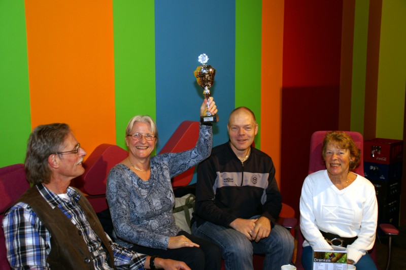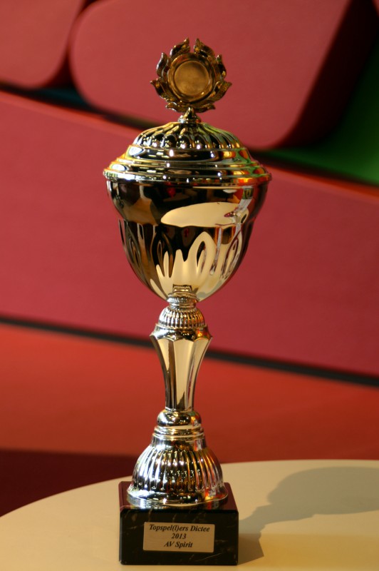 Ons team, bestaande uit Jan Bremer, Annette Thijs, Tineke de Vries en Peter van der Wal, maakte tijdens het Groot Lelystads Dictee het kleinste aantal fouten: gemiddeld 13,25. Doordat bij de correctie het dictee van Peter was zoekgeraakt, ging de jury er vanuit dat ons team uit slechts drie personen bestond in plaats van het vereiste aantal van vier. Daarom konden we niet meedingen naar de teamprijs. Toen het zoekgeraakte dictee boven water kwam, was de teamprijs al uitgereikt aan de ploeg van de familie Van Selm, die op een na de beste was met een gemiddelde van 16,2 fouten. De jury heeft na rijp beraad gemeend een gebaar te moeten maken om de prestatie van het team AV Spirit te belonen en zorgde voor een extra prijs: een prachtige beker die inmiddels een plaats in ons clubgebouw heeft gekregen. Komend jaar organiseren FlevoMeer Bibliotheek en de Stichting Vrienden van de Bieb gezamenlijk op 12 maart het Groot Lelystads Dictee. De literaire gast is dan Oek de Jong. De winnaars van de “Topspel(l)ers Dictee 2013-beker” zijn vast van plan dan weer mee te doen. Als je interesse hebt om het team te versterken, kun je je melden via: info@test.avspiritlelystad.nl.