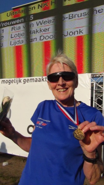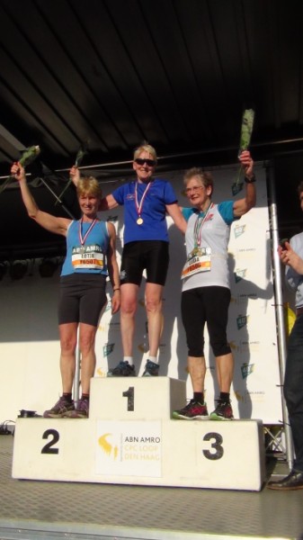 Samen met Willem Landman stond ik vooraan bij de start. Dolf Bartels stond ergens achterin. Ik had mezelf ingeprend met dit plotselinge warme weer lekker te gaan lopen en niets te forceren. Willem was ik bij de start al gelijk kwijtgeraakt. De eerste 2 kilometers bleken achteraf toch nog het snelst te zijn, maar daarna kon ik mijn tempo aardig vasthouden. Het verbaasde me dat ik veel lopers moest passeren en zigzaggend mijn weg moest vinden. De eerste drankpost stond pas na 6,5 km. Verder was de organisatie prima. Op de boulevard stond Ron mij aan te moedigen. Op het laatst was er nog een extra drankpost ingericht, maar die stond niet duidelijk aangegeven, waardoor ik deze miste. Nu leek het wel of ik nog meer dorst kreeg. De laatste kilometers waren zwaar, mijn voeten voelden aan als of ze in brand stonden. Zeker verkeerde sokken aangetrokken. Met de wetenschap dat de finish dichtbij was en de toejuichingen van het publiek kon ik nog in een redelijk tempo doorgaan. Uiteindelijk finishte ik in een tijd van 1:48:37 uur, waar ik heel tevreden mee was. Ik had al lang geen halve marathon gelopen. Na de finish gauw een droog shirtje aangetrokken en direct naar de prijsuitreiking, die al gestart was met categorie Vrouwen 35. Alle prijswinnaars stonden al klaar bij het podium midden op het Malieveld, maar ik had geen namen gehoord. Toen categorie V65 aan de beurt was, werd eerst nummer 3 en 2 genoemd en uiteindelijk, ja hoor, bleek ik 1ste te zijn! 6 Jaar nadat ik in categorie V60 kampioen was geworden was het mij weer gelukt. Dit keer werd er geen Wilhelmus gespeeld. Na afloop nog even een biertje met Willem en Dolf gedronken, die had ik dus mooi achter mij gelaten.