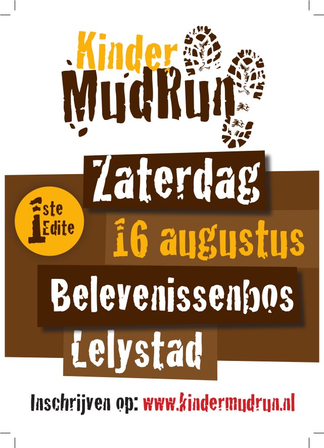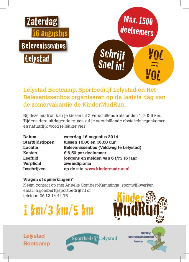 Op zaterdag 16 augustus, de laatste zaterdag van de zomervakantie, organiseert Sportbedrijf Lelystad, Lelystad Bootcamp en Stichting Het Belevenissenbos voor de allereerste keer in Nederland de KinderMudRun. Zie voor wat het is de bijgaande flyer (PDF) of kijk op www.kindermudrun.nl . Het is een mooi evenement om na je vakantie sportief bezig te zijn en aan je conditie te werken. De organisatie stelt je in de gelegenheid om voor een gereduceerd tarief mee te doen. In plaats van € 6,50 kost deelname € 5,-. Wil je daar gebruik van maken, vul dan de speciale kortingscode Spirit2014 in bij het betaalscherm nadat je hebt opgegeven welke afstand je wilt afleggen en welk tijdstip je wilt starten. Als je in één keer ook je familie of vrienden opgeeft, krijgen ook zij de korting. Er mogen maximaal 1.500 deelnemers meedoen. Snel opgegeven wordt aangeraden.