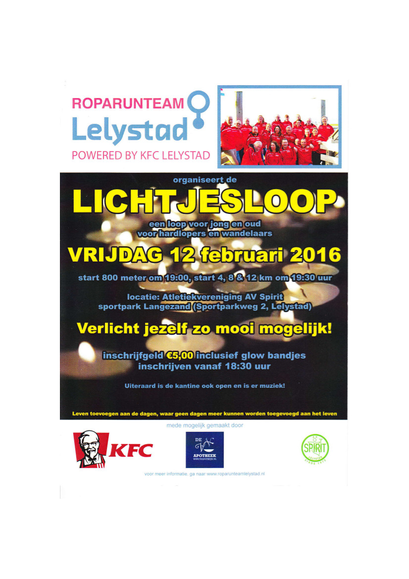 Vrijdag 12 februari start de 800 meter om 19:00 en de 4,8 en 12 km om 19:30 uur. Bij AV Spirit kan je je inschrijven vanaf 18:30 uur. Inschrijfgeld is 5 euro, inclusief glow bandjes. Jezelf verlichten is natuurlijk nog veel leuker!! Er is een DJ aanwezig, de kantine is open en onze hoofdsponsor KFC deelt uit.