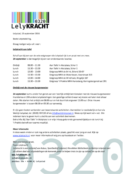 In deze week vinden er ook nog andere activiteiten plaats, geschikt voor jong en oud. Kijk op www.lelykracht.nl. Voor meer informatie of volg ons op Facebook en Twitter.
