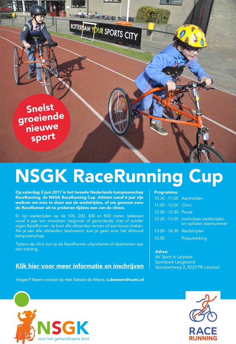 Op zaterdag 3 juni 2017 organiseert AV Spirit Lelystad in Lelystad de NSGK RaceRunning Cup. Op dit sportieve evenement is het mogelijk om tijdens de clinic kennis te maken met de RaceRunner. Een mooi moment om te kijken of deze sport bij je past!