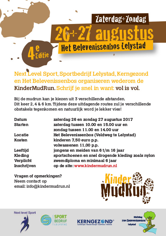 Op 26 en 27 augustus wordt in Lelystad weer de KinderMudRun georganiseerd door Sportbedrijf Lelystad. Zoals elk jaar is de organisatie afhankelijk van vrijwilligers om het evenement zo veilig mogelijk te laten verlopen.
