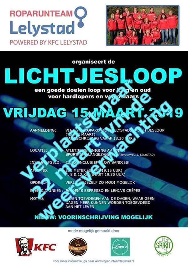 Aanmelding: | Via https://roparunteamlelystad.nl/lichtjesloop/ (tot 21 maart) Na-inschrijving vanaf 18:30 uur |