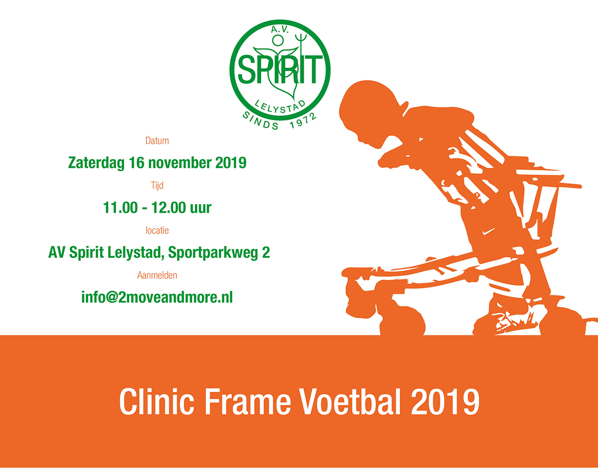 Op zaterdag 16 november 2019 organiseert AV Spirit Lelystad van 11.00 tot 12.00 uur een clinic Frame Voetbal. Frame voetbal is een vereenvoudigde voetbalvorm, waarbij mensen die gebruik maken van een rollator/looprekje, ook kunnen genieten van sport. Bewegen, plezier en sportiviteit in de breedste zin van het woord staan bij deze vorm van voetbal voorop. Buitenspel staan is niet langer nodig.